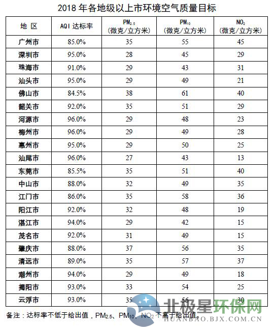 廣州市二氧化氮年均濃度下降到45微克/立方米以下,佛山市PM2.5年均濃度下降到38微克/立方米以下,肇慶市PM2.5年均濃度下降到37微克/立方米以下,東莞市臭氧8小時第90百分位數下降到165微克/立方米以下,其他指標年均濃度達標;全省其他市環境空氣質量全面達標并有所改善。