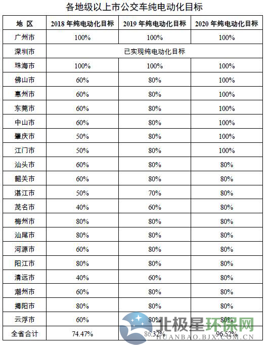 2018年起,各地級以上市每年更新或新增公交車全面使用純電動或燃料電池汽車。2018年年底前,廣州、珠海市要全面完成公交車純電動化,佛山市全市柴油公交車全部更新為純電動公交車。2020年年底前珠三角地區實現公交車純電動化,粵東西北地區各市公交車純電動化率達80%以上。各地級以上市公交車純電動化目標見附件3。