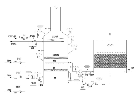 (1)冷凝降溫和除霧模塊:煙氣通過原引風機后進入該模塊,模塊填料段上部布冷卻水、底部出水,水與煙氣直接接觸,煙氣溫度由60度降低至35度,煙氣中有機氣體冷凝至直接接觸的水中,且煙氣中有少量氣態水析出為液體水,煙氣夾帶有霧沫進入除霧器后使氣液完全分離。